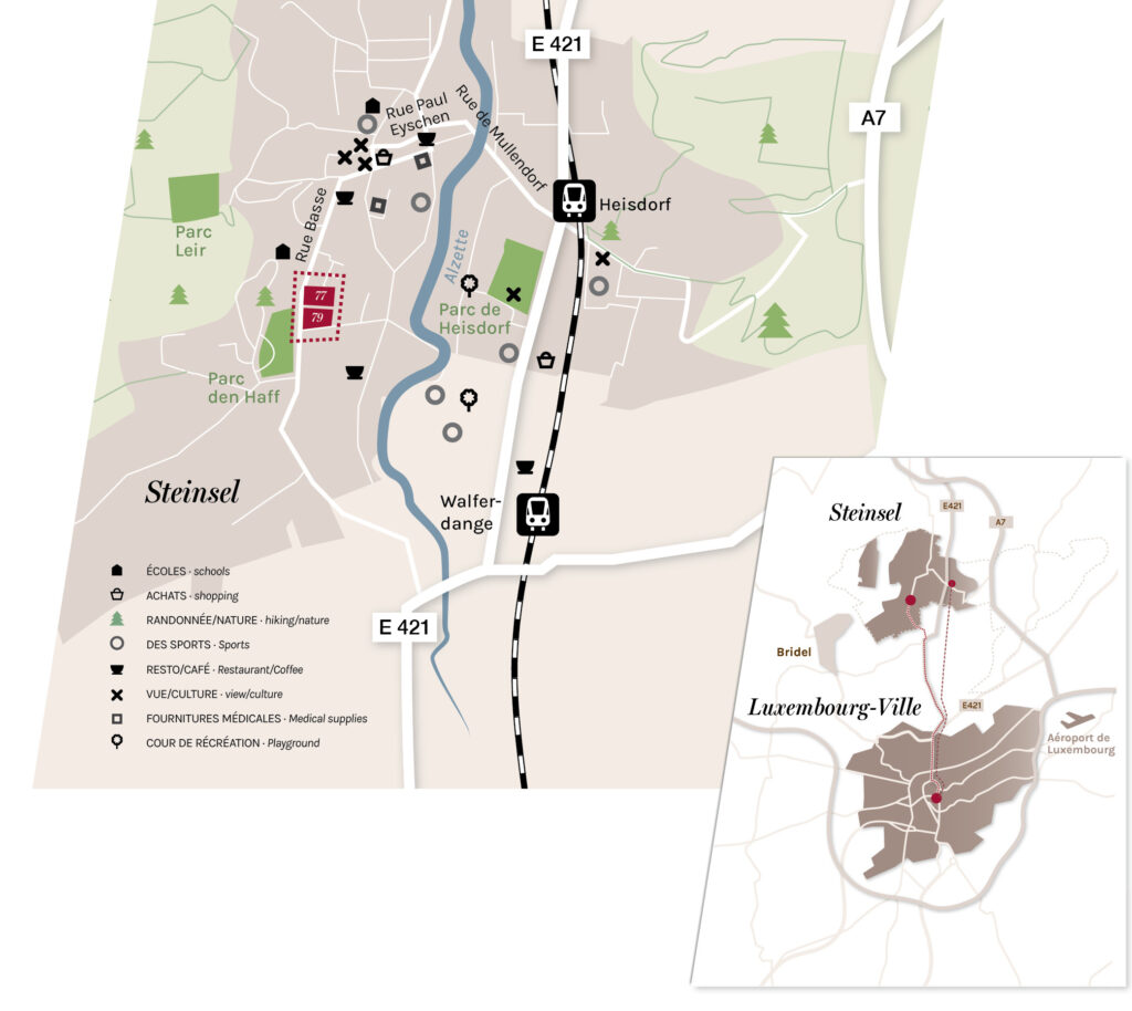 Le paysage vallonné est idéal pour la randonnée, le vélo et l‘observation de la nature. La forêt „Gréngewald“ offre de belles promenades. L‘aéroport de Luxembourg-Findel est à 13 km au sud-est, accessible en voiture ou en transports en commun. Les principales agglomérations voisines sont Luxembourg-Ville au sud et Mersch au nord.