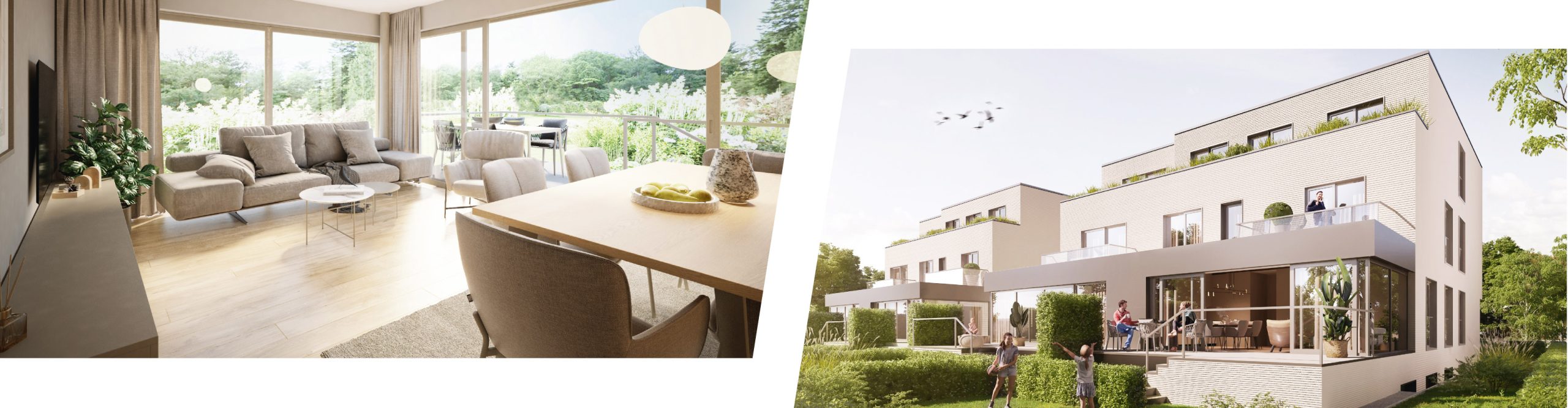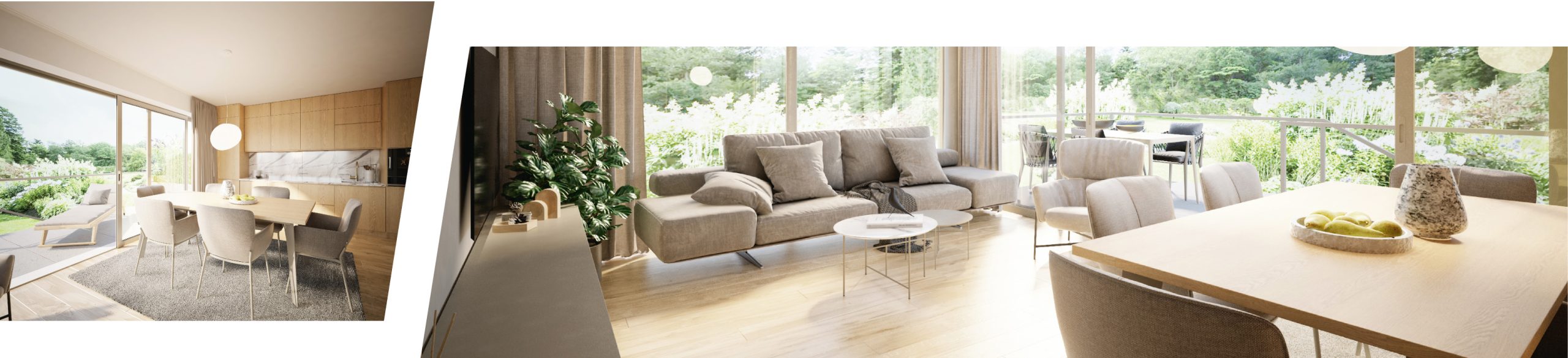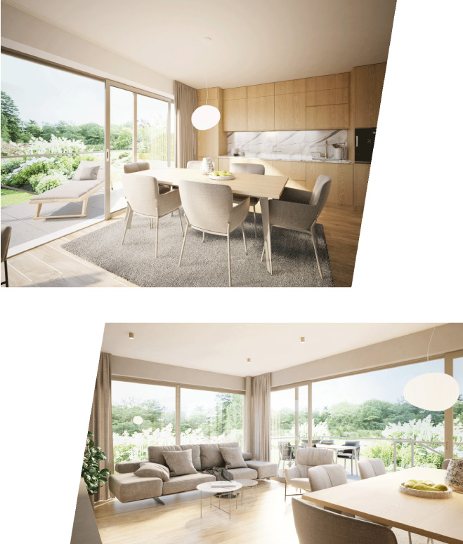 Chaque appartement présente un layout individuel, en fonction du nombre de pièces, et dispose de sa propre terrasse ou balcon. Les matériaux et les couleurs sont choisis dans des tons chauds et naturels, pour donner une ambiance chaleureuse.