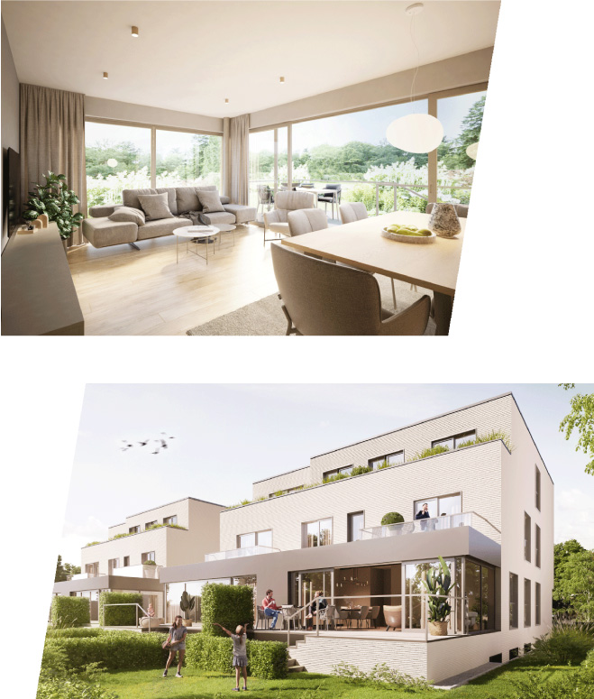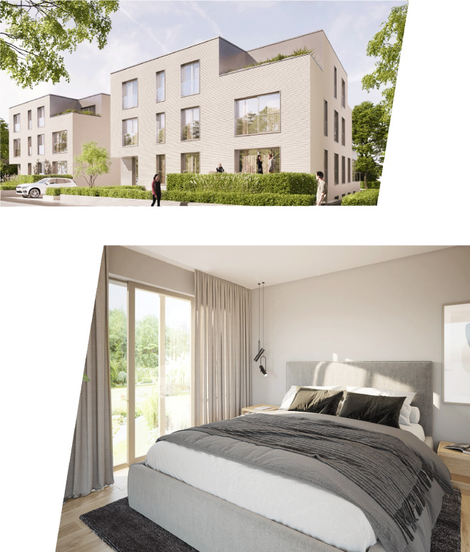 L‘ensemble du bâtiment est conçu pour être accessible aux PMR. La conception des façades extérieures est basée sur la simplicité et la clarté sous la forme d‘une façade perforée classique. De grandes et nombreuses ouvertures de fenêtres inondent les intérieurs des appartements de beaucoup de soleil et de lumière du jour. Pour augmenter le sentiment de bien-être des résidents, un accent est mis sur l‘utilisation de matériaux de construction naturels et l‘intégration de la nature dans le concept, par exemple sous la forme de parterres plantés sur les balcons ou des toitures végétalisées permettant de retenir les eaux de pluie.